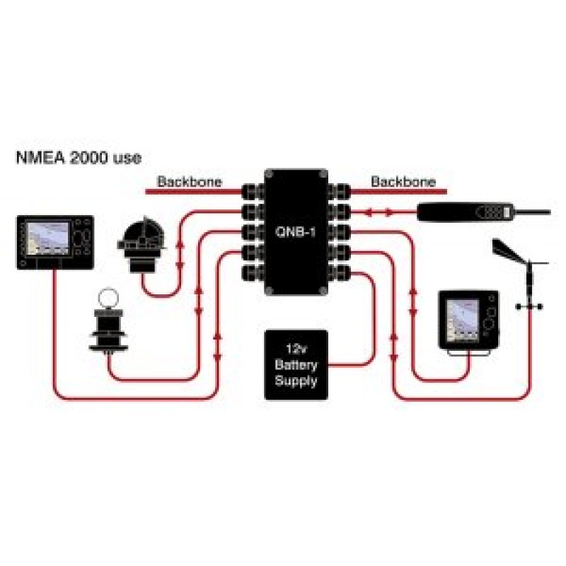 When used on an NMEA 2000 network, the QNB-1 is a multi-drop network backbone connection block, adhering to the barrier strip connection type detailed in the NMEA 2000 specification. This allows for 2 backbone connections (in & out), up to 6 drop connections and a power entry point.