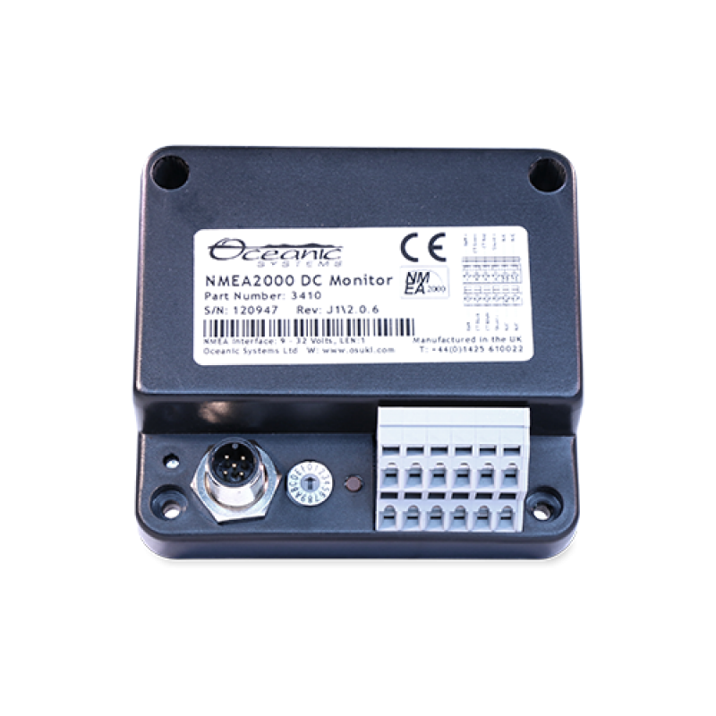 The Oceanic Systems 3410 DC Monitor accurately measures the DC voltage, the DC current and the attached battery temperature and reports them over the NMEA2000® network. It also calculates the current state of charge and the battery life remaining at the current rate of discharge.
