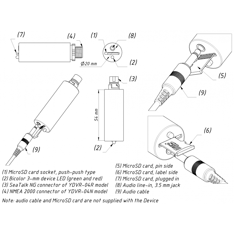 The Recorder is intended for storing data from the onboard network of the vessel on a MicroSD memory card. The onboard network of a typical cruise yacht has data about the position, course, speed, depth, water temperature, log, wind speed and direction, and AIS data of nearby vessels. Digital data from the motor, water and fuel tanks, battery level, etc. may also be available.