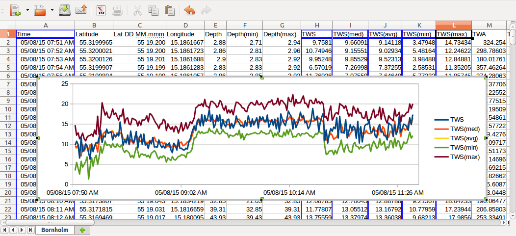 YDVR Converter software that comes with the Recorder is installed on a personal computer and allows GPX and CSV files to be generated with the vessel's track and extensive information about the sailing conditions (click on a track's point at the map above for example), including weather, depth, engine, and even tracks of nearby vessels with AIS. GPX files can be viewed in Google Earth, Garmin MapSource and other cartographic applications. They can also be loaded into newer models of Garmin and Raymarine chartplotters. CSV files may be opened in spreadsheet applications like Microsoft Excel or LibreOffice Calc to visualize data using charts and build the graphic reports.
